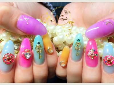 セーラームーンの様なパーツを乗せた素敵なロングネイルです